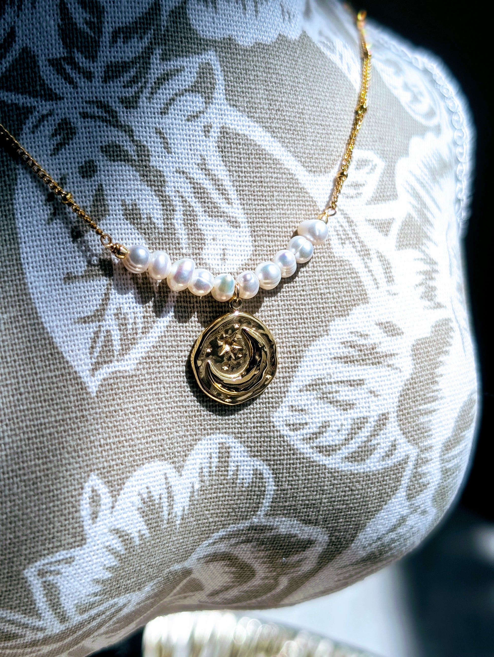 14K Gold Plated Necklace with Freshwater Pearls and Gold Coin Pendant