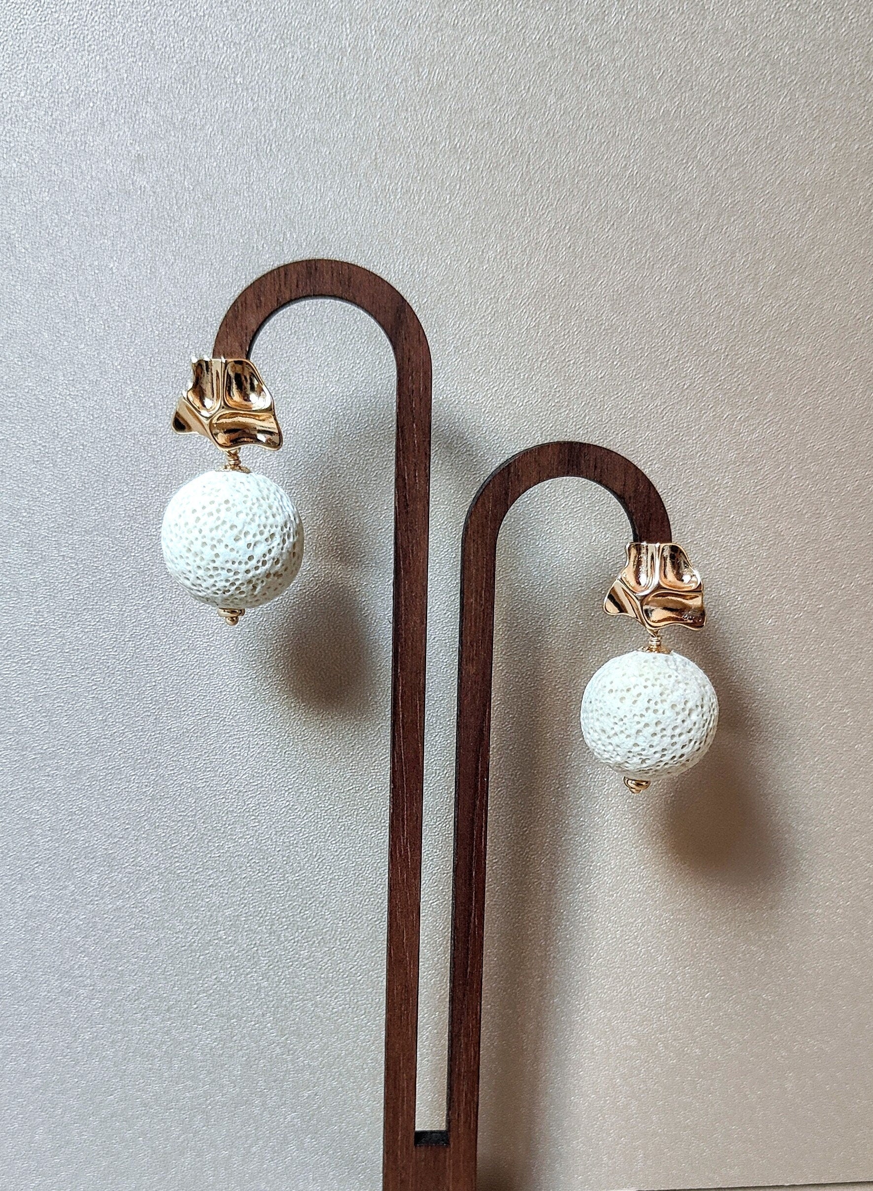 The simple pearl white color of these lava stones and the extraordinary texture are a perfect blend with fun and elegance!! This is a perfect pair of earrings for causal wear that goes very well with outfits in any color!