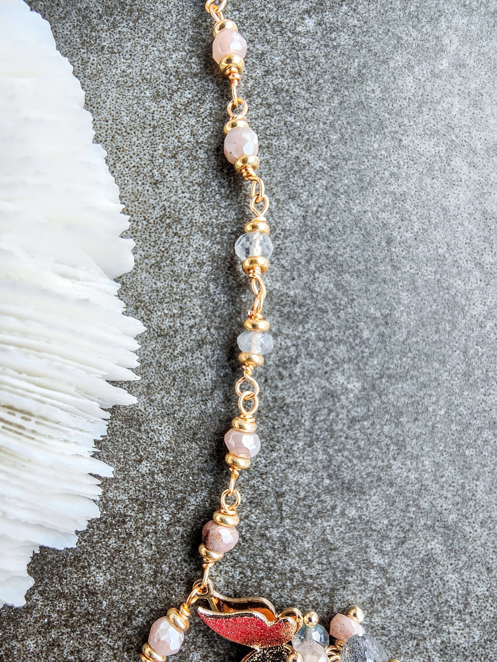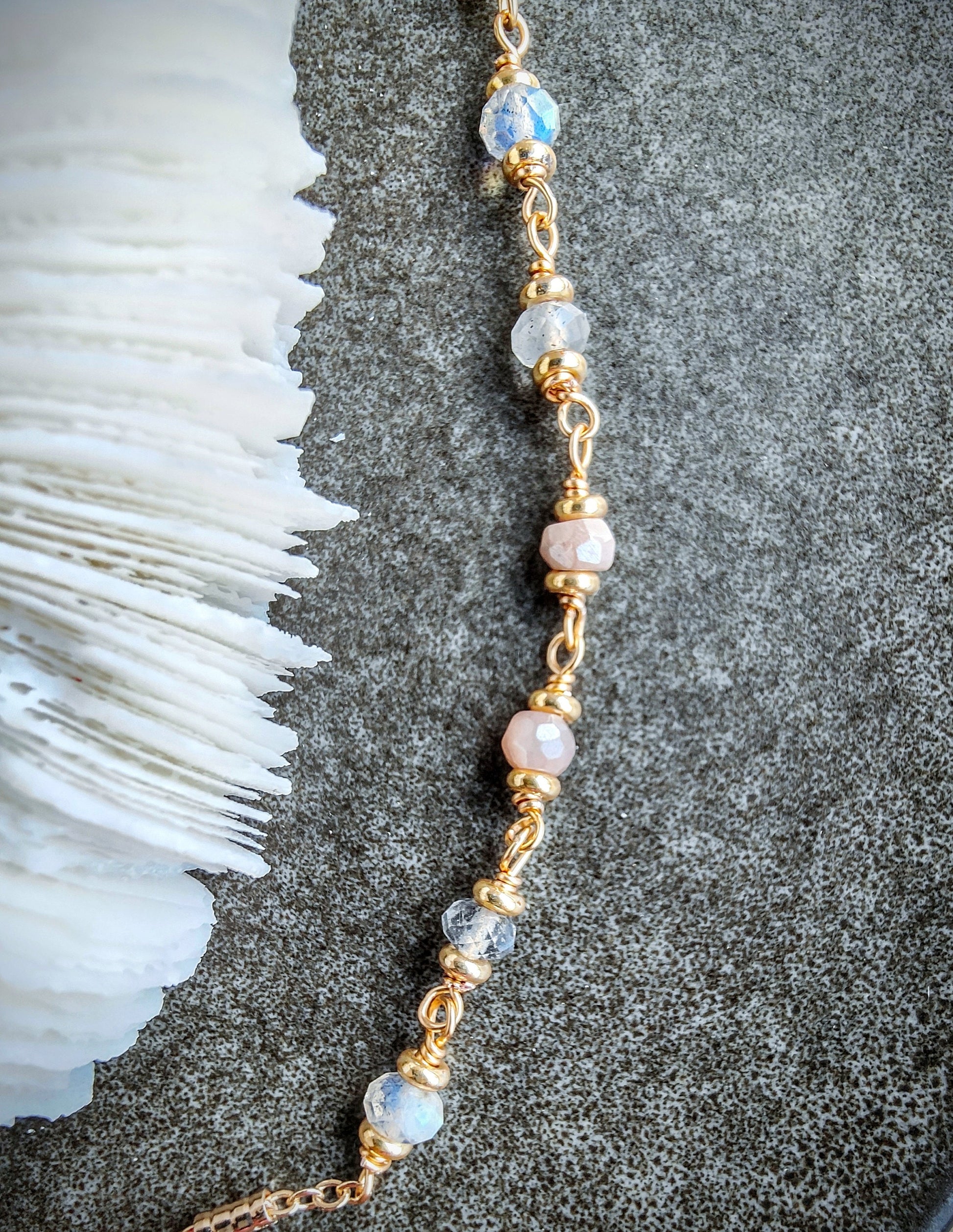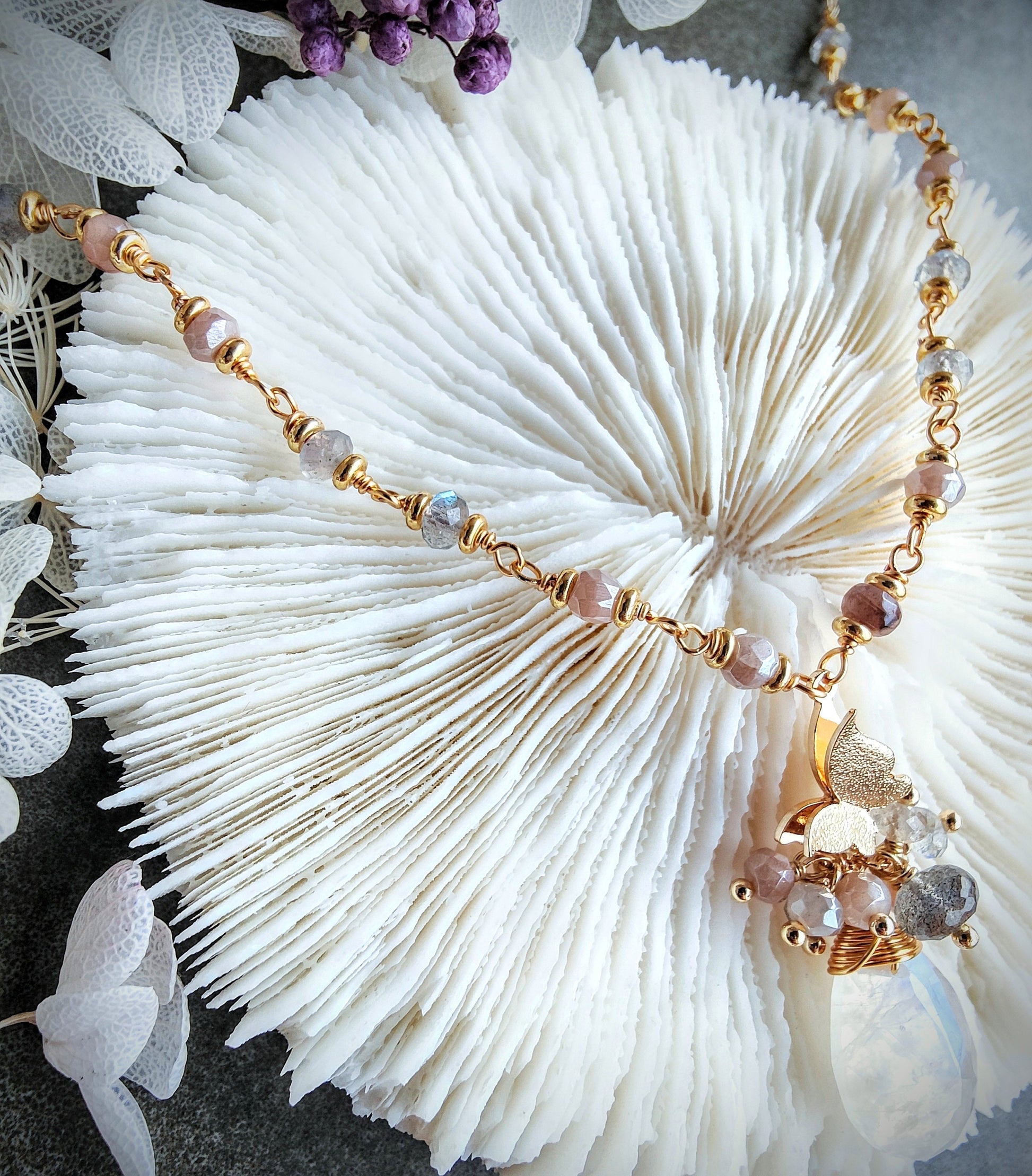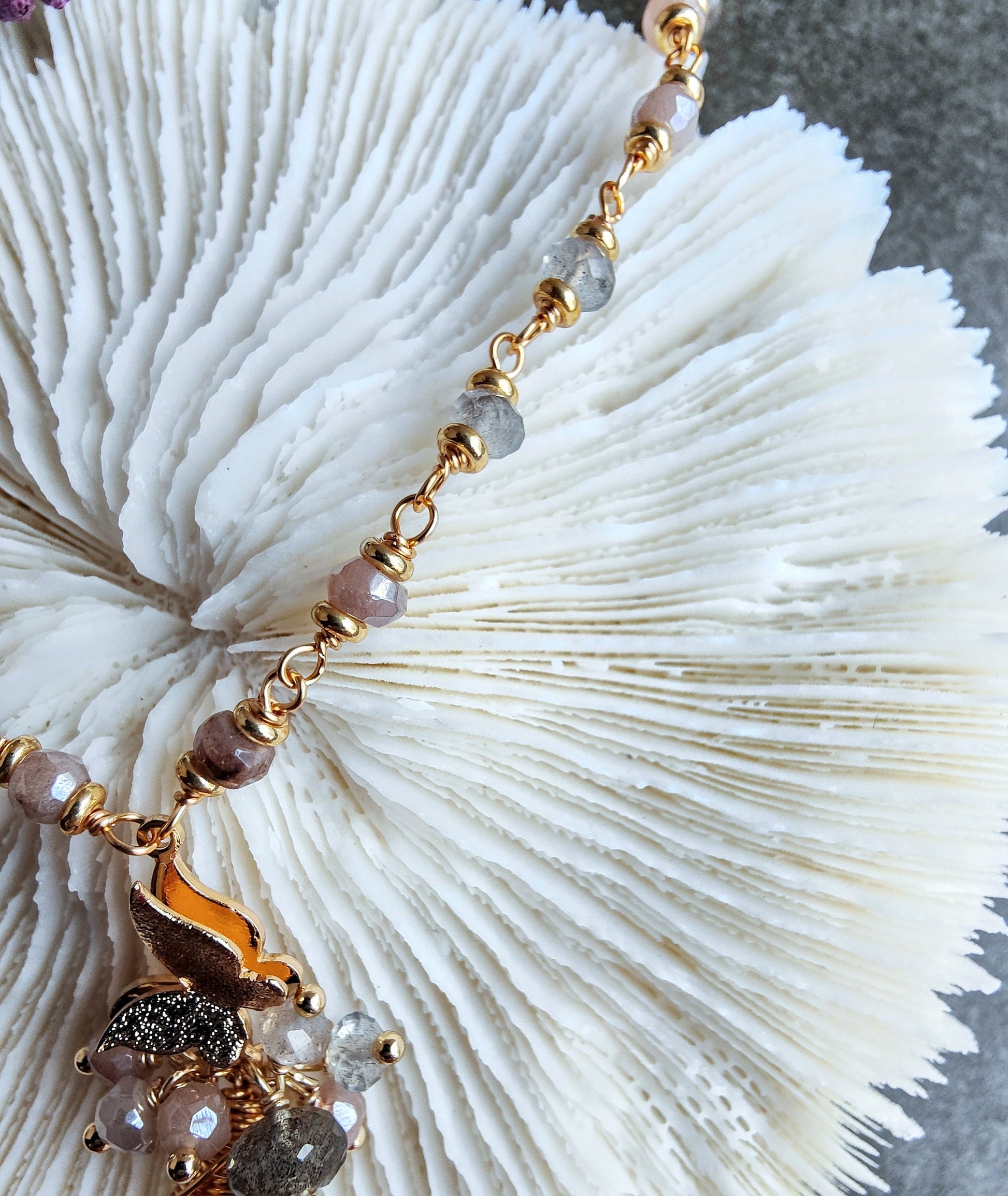 The necklace is carefully adorned with grey labradorite and peach moonstones, their soft, earthy tones creating a harmonious blend of sophistication and natural allure. A 14K gold-plated chain, measuring 47 cm with an additional 5 cm extension, completes the design, offering an adjustable fit to suit any neckline.