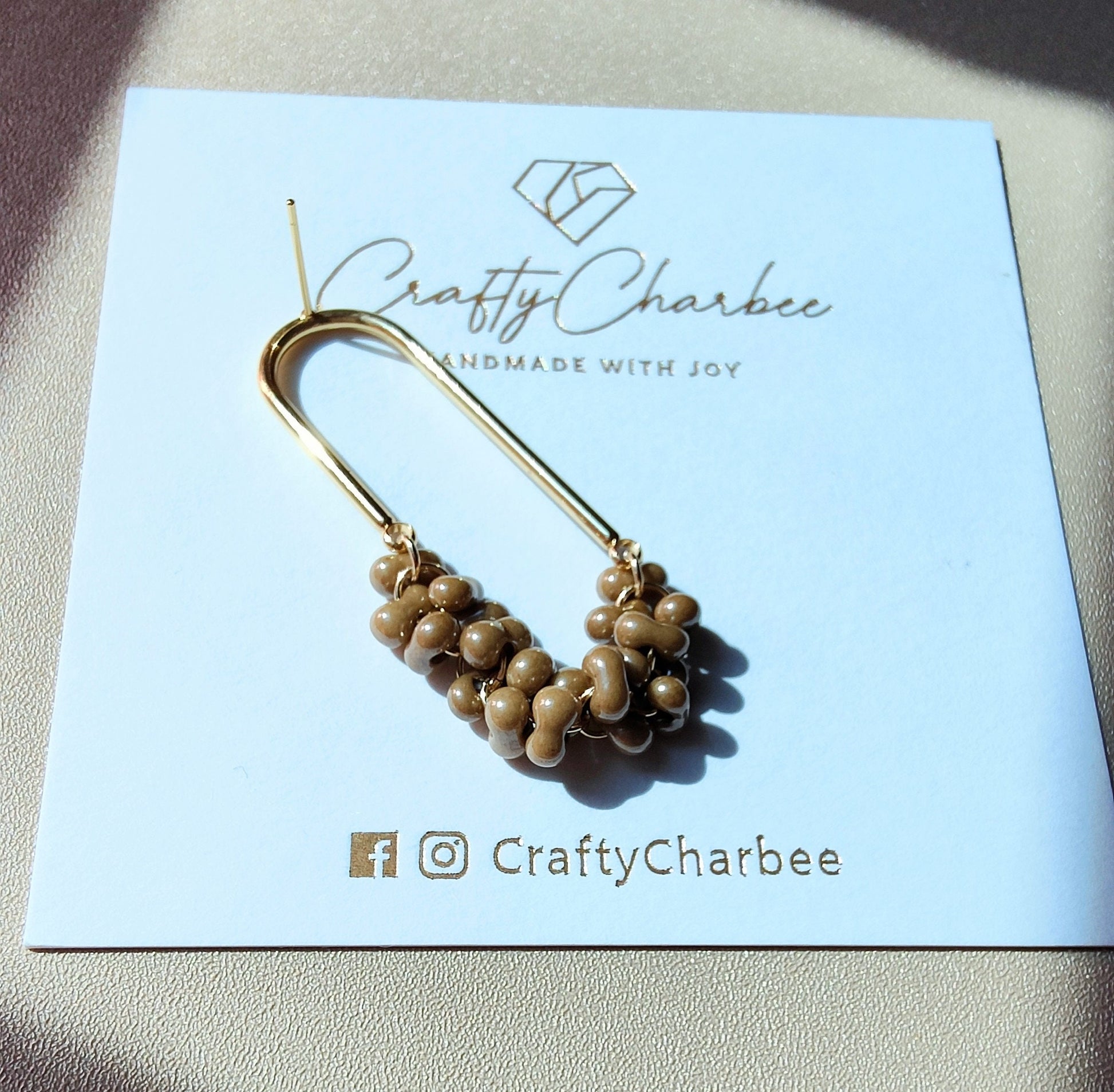 Beaded U Shaped 14K Gold Plated Earrings, Beige Jolly Beads