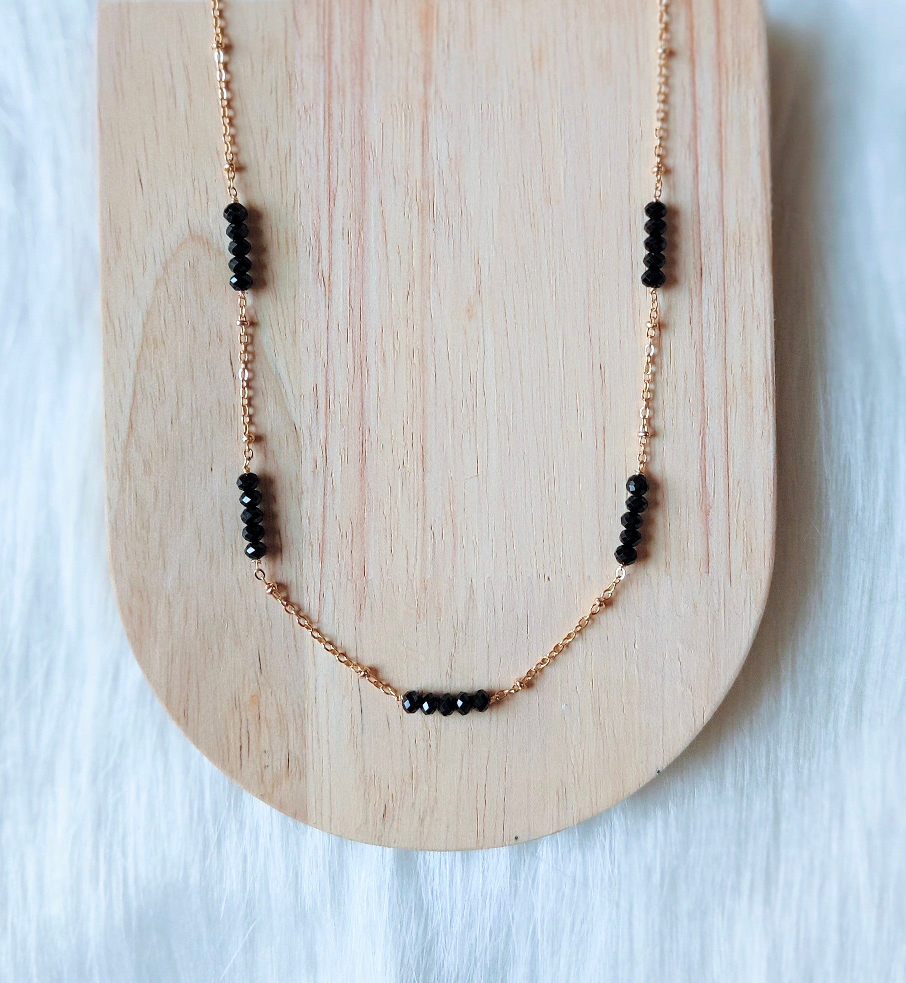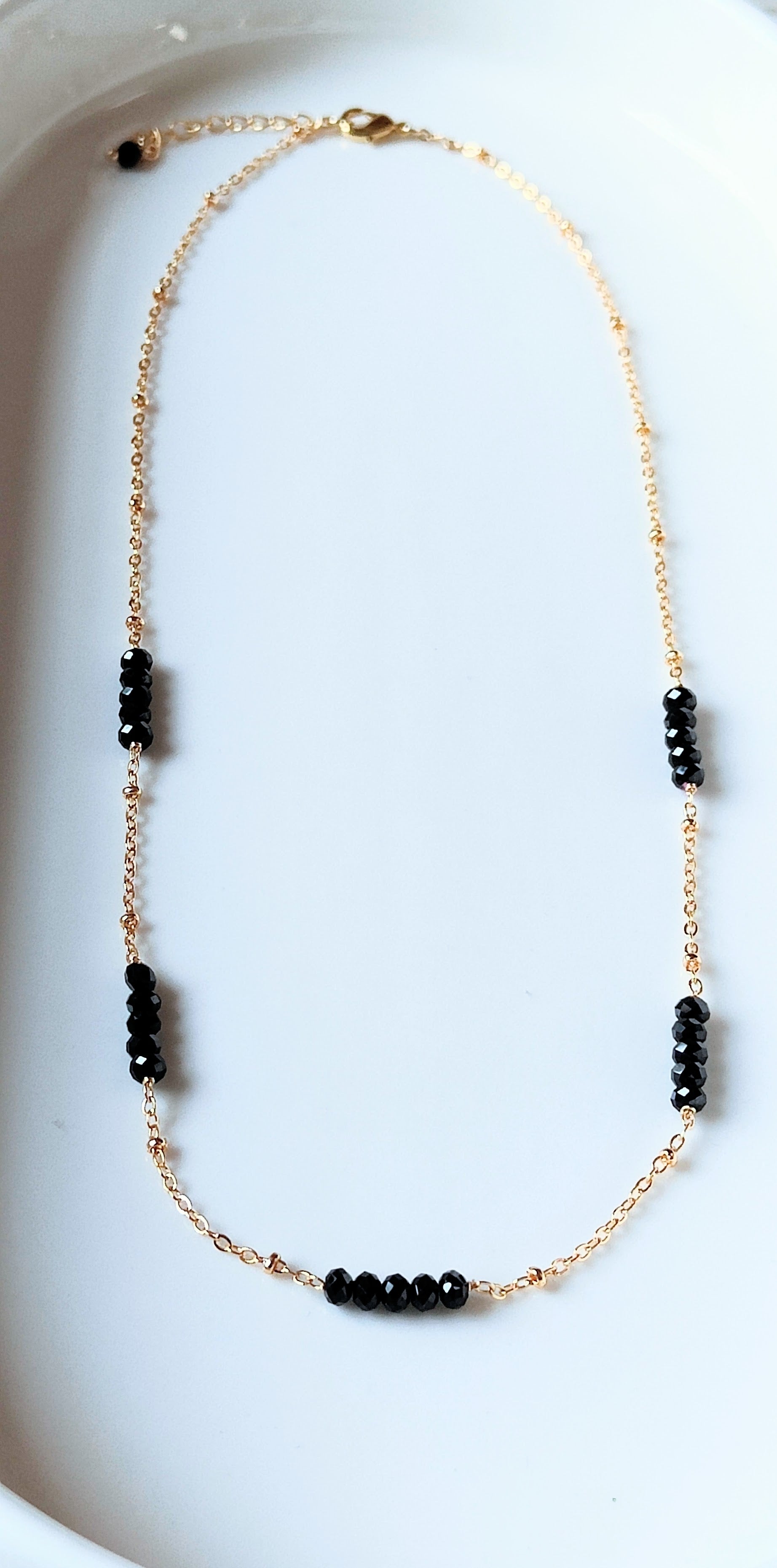 Step into the spotlight with our handmade Black Spinel Necklace—crafted for the woman who owns the night. Chic clusters of faceted black spinel beads catch the light like a starry sky, strung along a delicate 14K gold-plated chain that measures 45cm with a 4cm extension for adaptable style. This stunning contrast of dark sparkle and warm gold instantly upgrades any look.