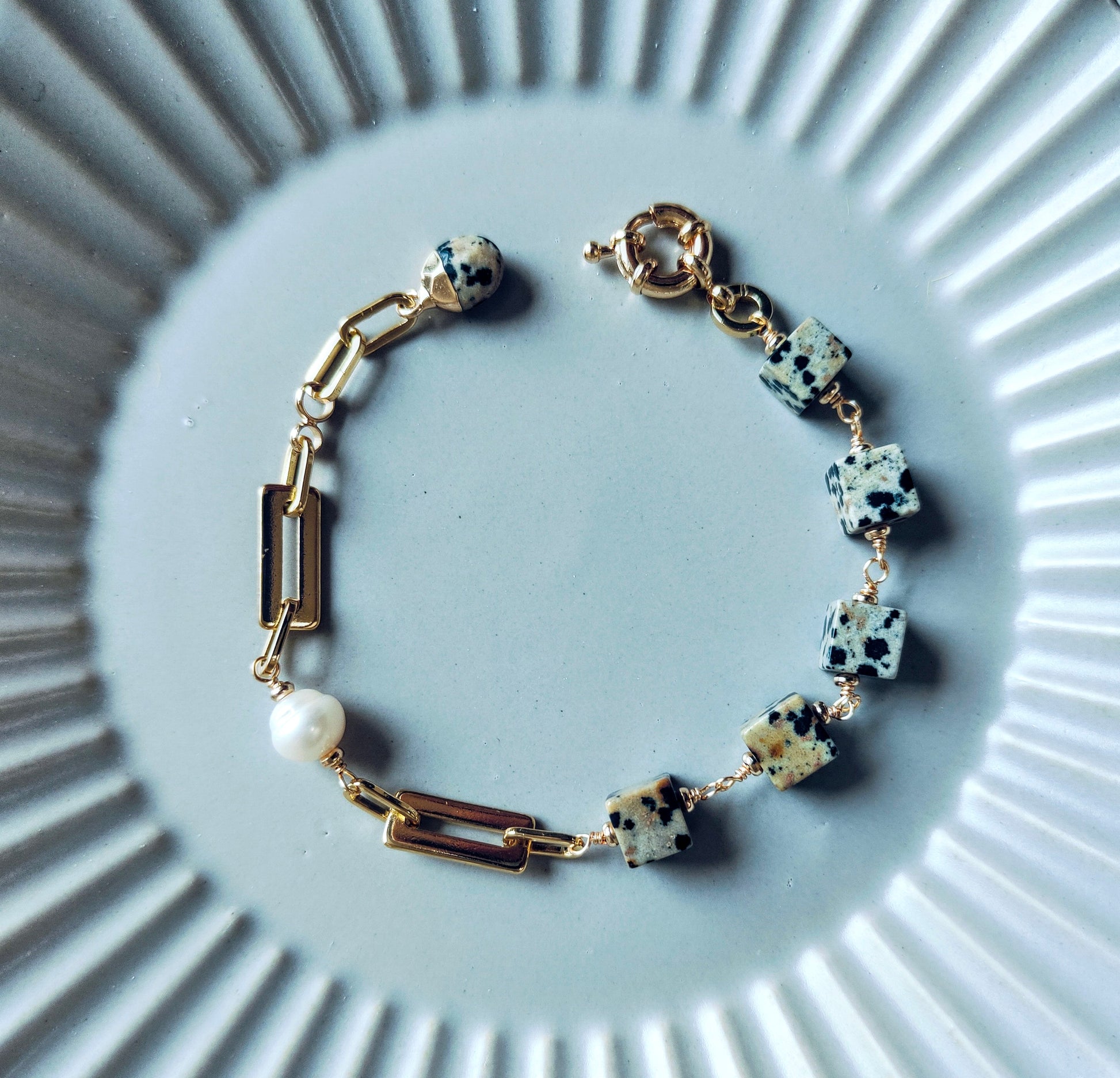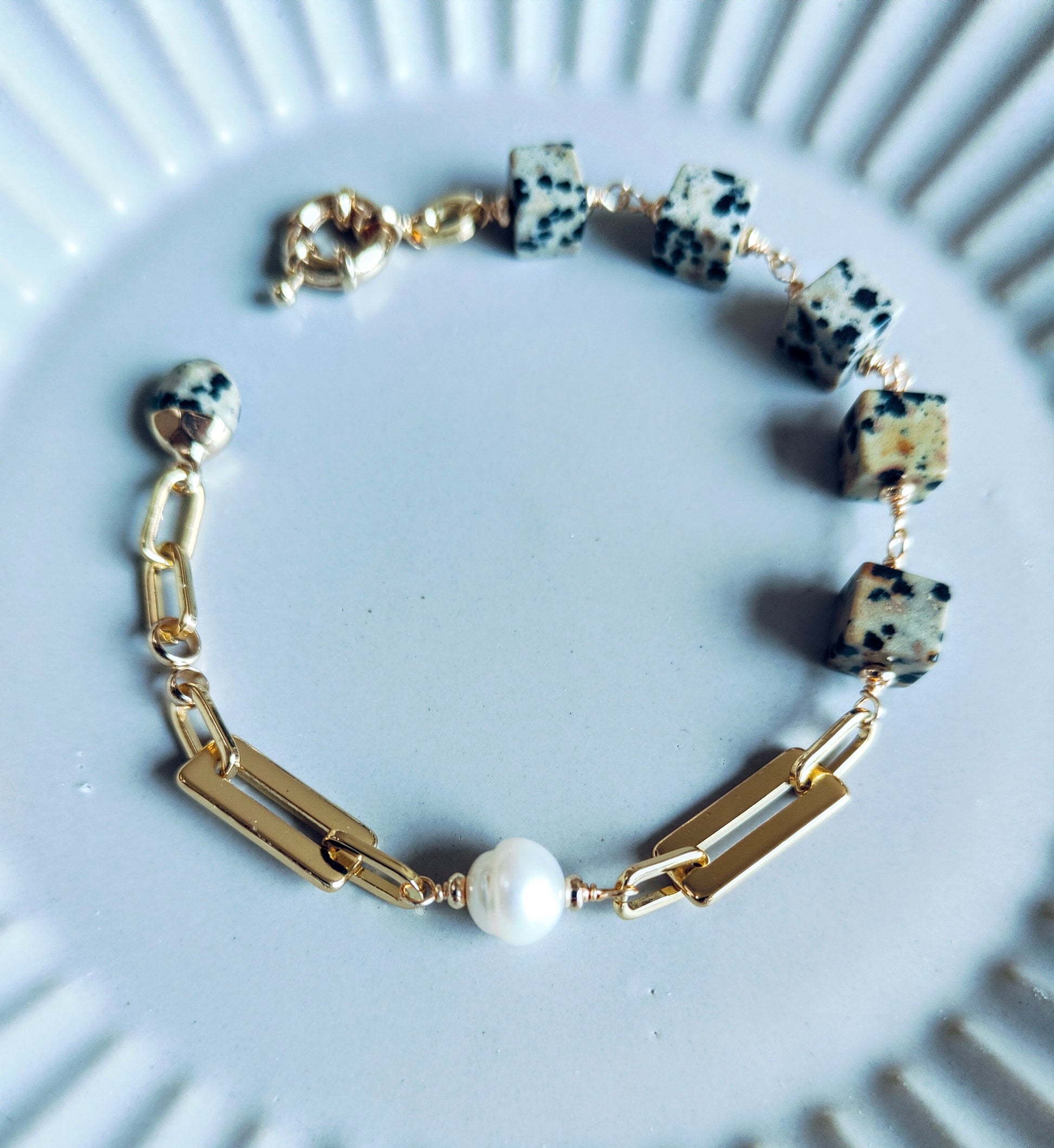 In the ππ¨π¨π€π’ππ¬ & ππ«πππ¦ ππ¨π₯π₯ππππ’π¨π§, I have this fun and modern bracelets. Each one features a mix of different Dalmatian Jasper shapes and sizes, paired with a sleek 14K gold-plated chain and clasp.