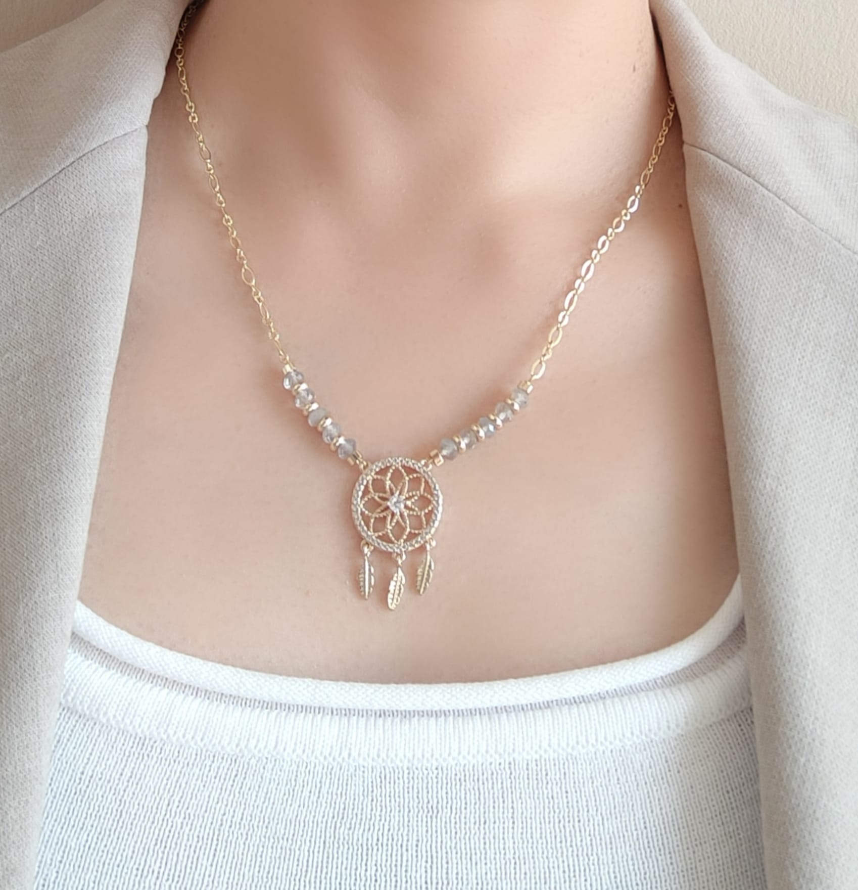 - Materials: Natural grey labradorite stones, rhinestone dream catcher pendant, 14K gold-plated chain